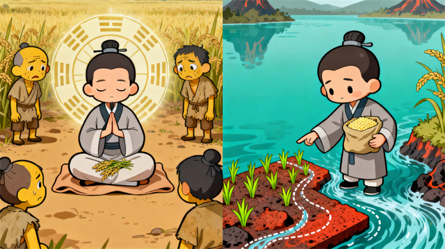 范蠡初到,见此地贫瘠寒冷,颗粒无收,但又见天空异象,就推演卜卦,算出未来此地必将要出一个旷世奇才,但奈何此地贫瘠而百姓饱受困扰。为解当地百姓疾苦,他就把卜卦中占卜到的中京显德府卢城稻种引入此地,借镜泊湖极寒之水灌溉在炎热的火山石板上(一阴一阳,五行相生),这样种出的稻米遇寒不凋,见金则丰。范蠡将此法传授给当地老百姓,遵循此法春耕夏耘,当地百姓从此年年丰收,财如泉涌。念及财神范蠡传授稻谷种植秘笈之恩,当地百姓遂将用此法种出的水稻命名为“财神稻”。