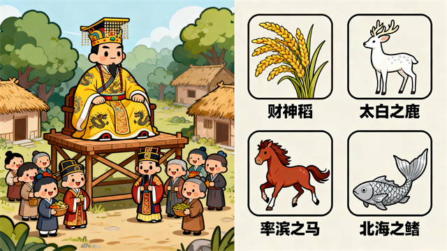 自此之后,历尽千年沧桑巨变,公元785年,文王路经此地发现此地百姓丰衣足食,地大物博,海产丰富,一片祥和,就在此地立国,更名为渤海国,并把当地的四宝财神稻(卢城之稻)、太白之鹿、率滨之马、北海之鳍列为朝贡臻品。